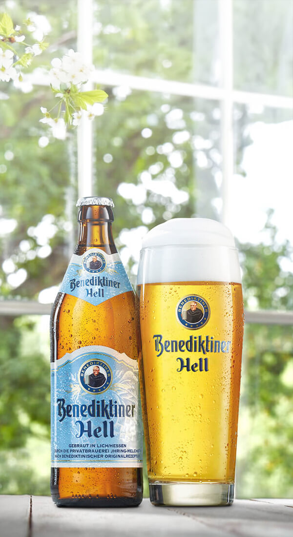 Benediktiner Hell ist ein Lagerbier mit goldgelber Farbe und angenehmer Malzsüße, mild im Geschmack. Gebraut in Lich/Hessen durch die Privatbrauerei Jhring-Melchior nach dem deutschen Reinheitsgebot.